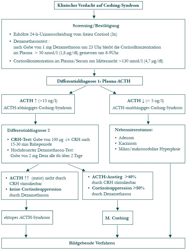 Für einen morbus cushing typisch sind ein vollmondgesicht (facies lunata), stammfettsucht, rötliche streifen der haut (striae rubrae), allgemeiner muskelschwund, erhöhte blutzuckerwerte.